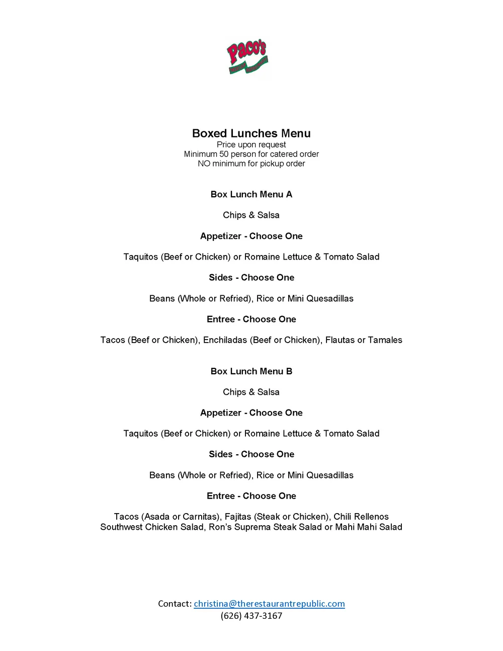 Pacos Lunch Box Menu Restaurant Backed Delivery And Catering